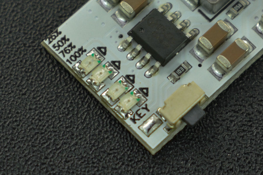 This is a DC charging and discharging integrated module, with 5V normally open output, which is not affected by load access and has a maximum load current of 2A. It features 4 levels of charge/discharge electricity indication and button-controlled output. The module comes with a built-in power management circuit that boosts a lithium battery to 5V and supports charging and discharging simultaneously. Besides, it has battery protection which makes it applicable for batteries without a protective board,