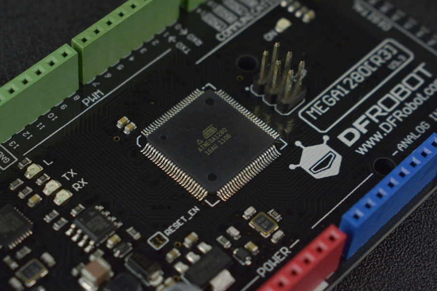 DFRduino Mega1280 is a microcontroller board based on the ATmega1280. It has 54 digital input/output pins, 16 analog inputs, 4 UARTs (hardware serial ports), a 16 MHz crystal oscillator, a USB connection, a power jack, an ICSP header, and a reset button. Because it has bootloader, it can download programs directly from USB. There is no need to use other external programs to burn.