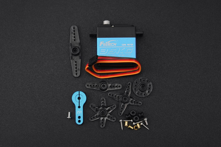 To enhance its water resistance, the servo's joints are fortified with waterproof gaskets, and the circuit board is coated with a waterproof varnish. Both the motor and the potentiometer are sealed with a specialized adhesive. These measures contribute to the servo's exceptional waterproof capabilities. Moreover, this servo is accompanied by a selection of different-shaped servo horns, enabling its application in a wider range of environments.