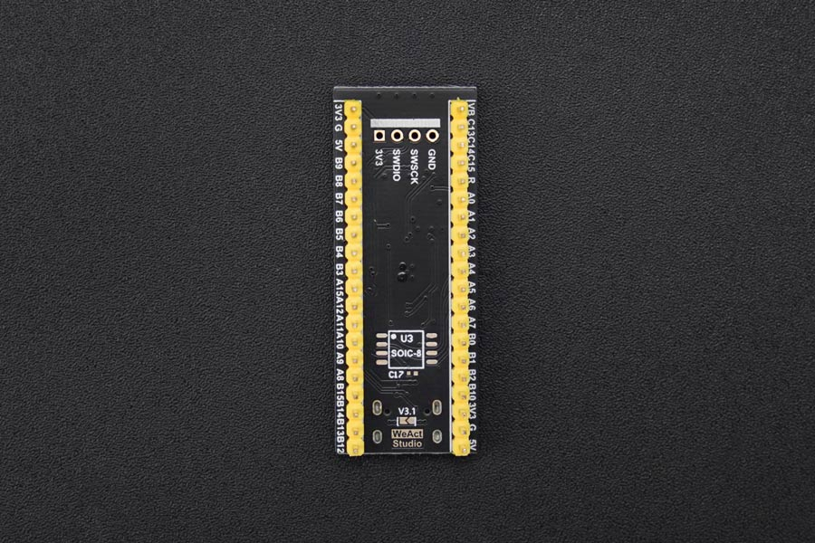 This compact STM32F411 development board can be well embedded in your projects. Featuring the STM32F411CEU6, this chip has 512KB of ROM, 128KB of SRAM and runs at 100MHz. There is a spot on the bottom for SOIC flash memory, which allows you to solder SPI flash memory to give yourself more space for data logging or file storage.