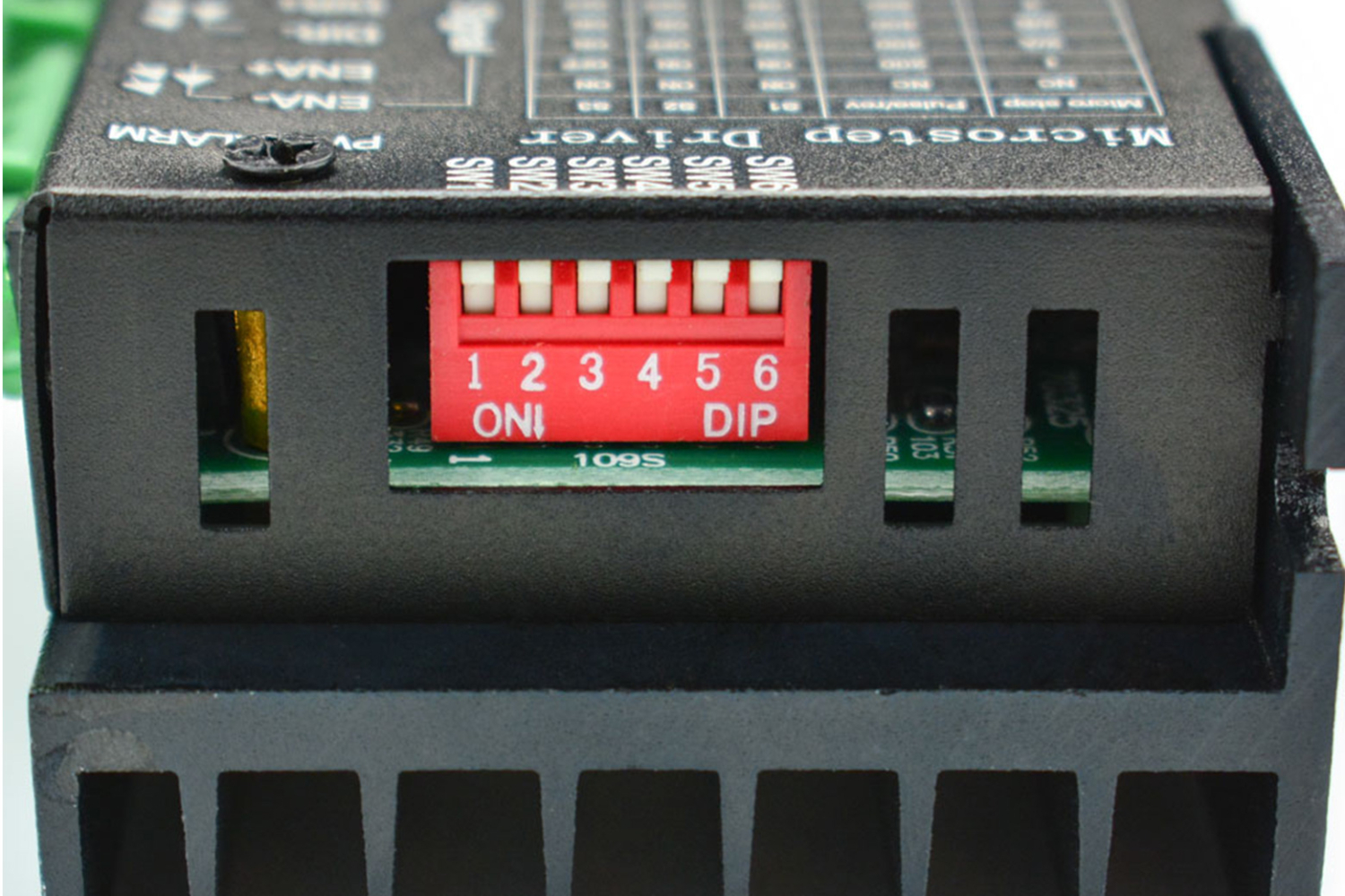 The stepper driver supports speed and direction control. You can set its micro step and output current with 6 DIP switch. There are 7 kinds of micro steps (1, 2 / A, 2 / B, 4, 8, 16, 32) and 8 kinds of current control (0.5A, 1A, 1.5A, 2A, 2.5A, 2.8A, 3.0A, 3.5A) in all. And all signal terminals adopt high-speed optocoupler isolation, enhancing its anti-high-frequency interference ability.