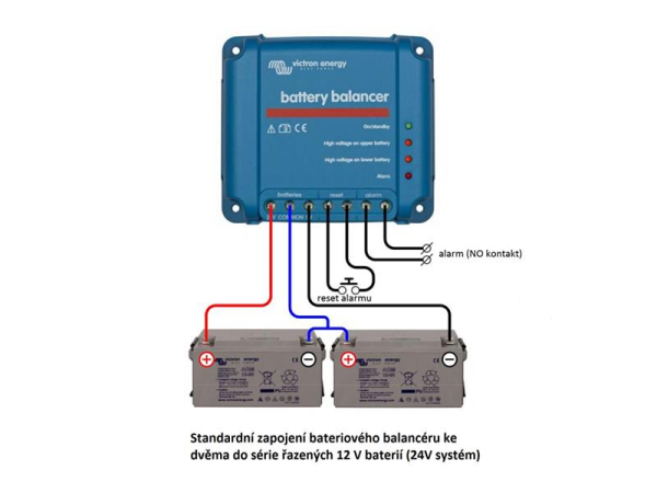 The solution is balanced charging using a battery balancer. It balances the state of charge of two 12 V batteries connected in series or several parallel series of batteries connected in series. As soon as the charging voltage of the 24 V system rises to more than 27.3 V, the battery balancer is activated and compares the voltage of two batteries connected in series. The balancer can redirect current of up to 0.7 A from one battery (or batteries connected in parallel) with a higher voltage to another battery. The result of the different charging current is a mutually identical state of final charge of all batteries.